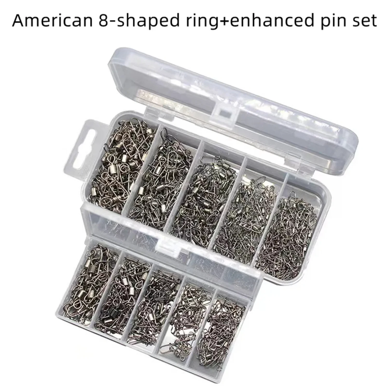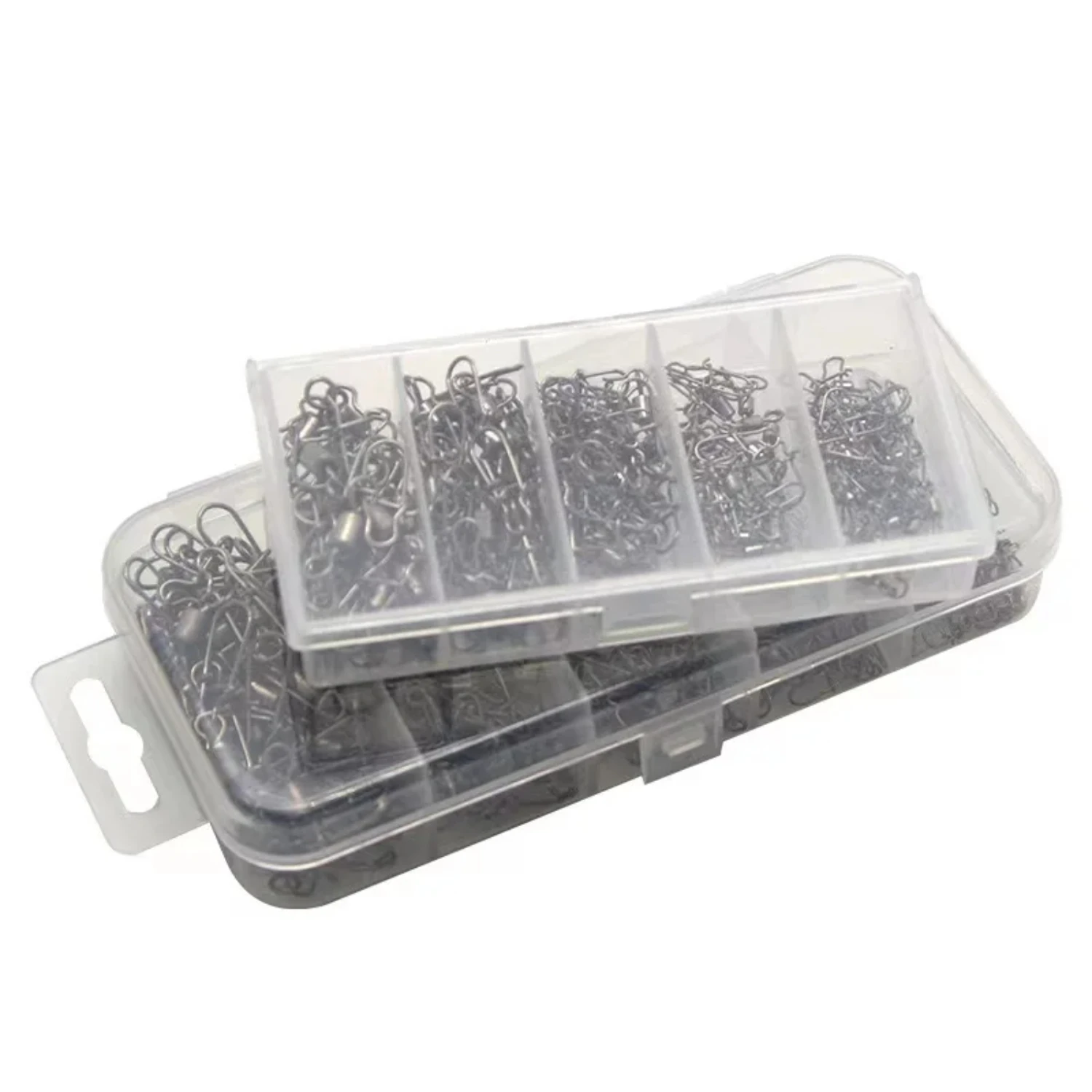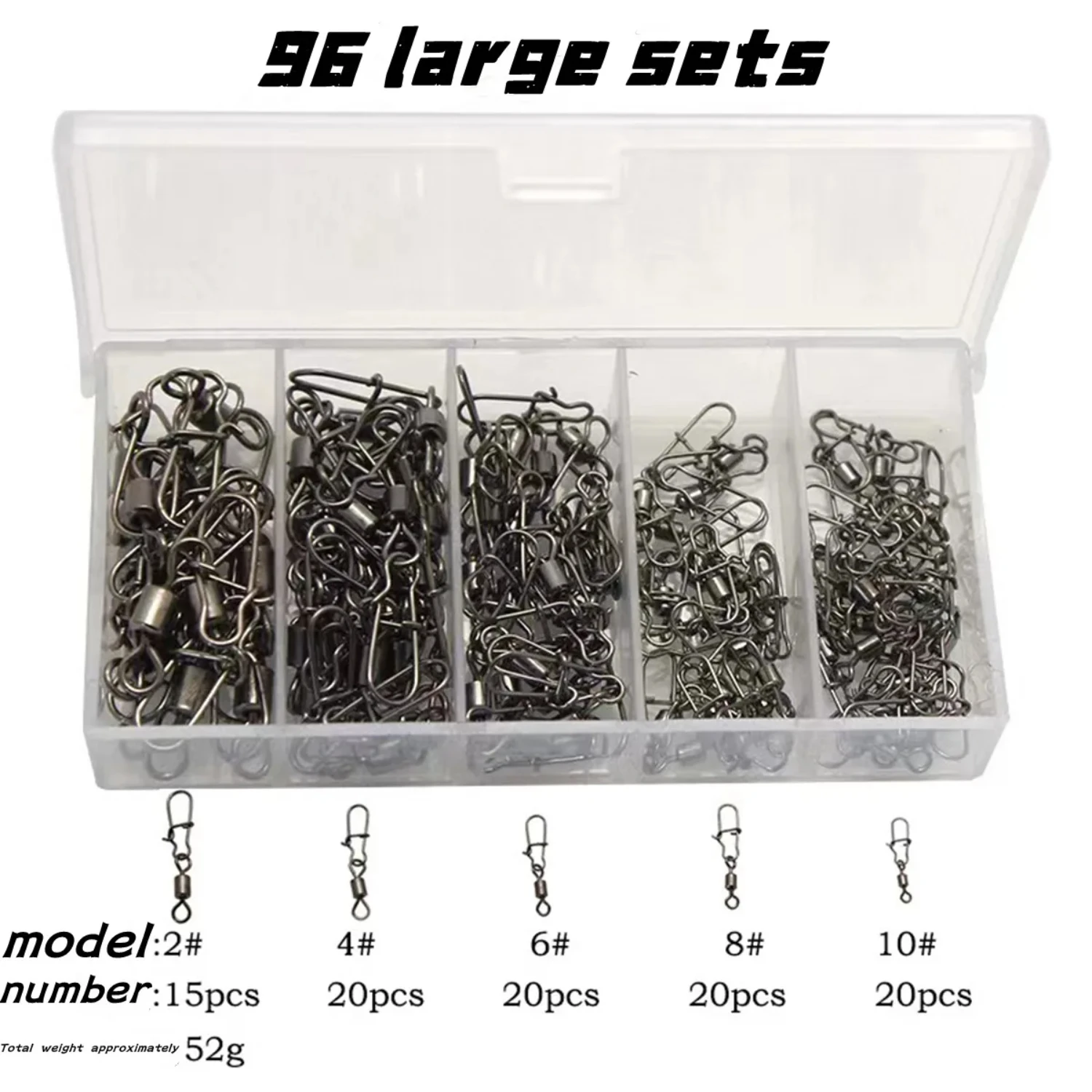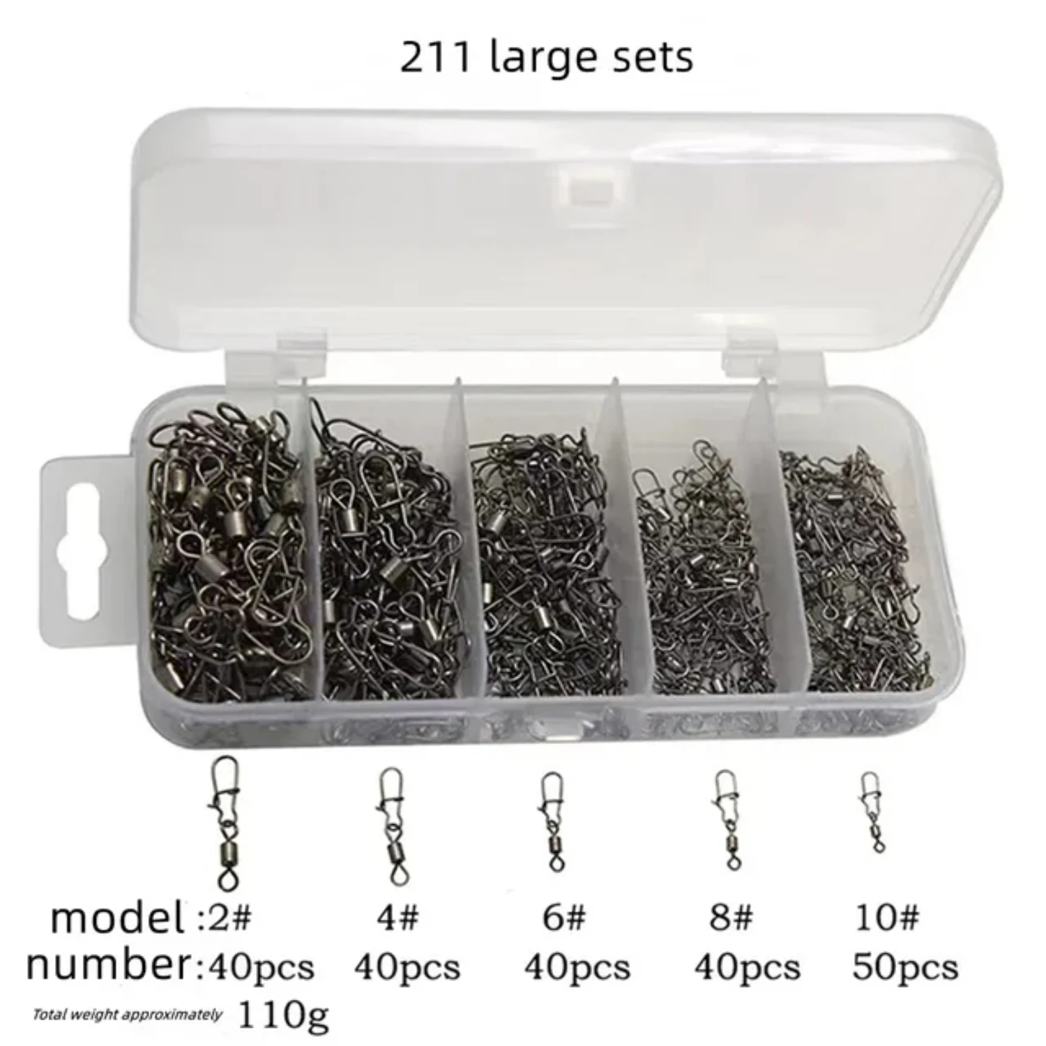 96-211pc/box Stainless Steel Fishing Connector Pins and Bearing Rolling Swivels offer an all-in-one solution for anglers who demand reliability, durability, and versatility. This box packs a wide range of sizes—from 4# to 12#—with a total count spanning from 96 up to 211 pieces, giving you the right components for various rigs and lures.