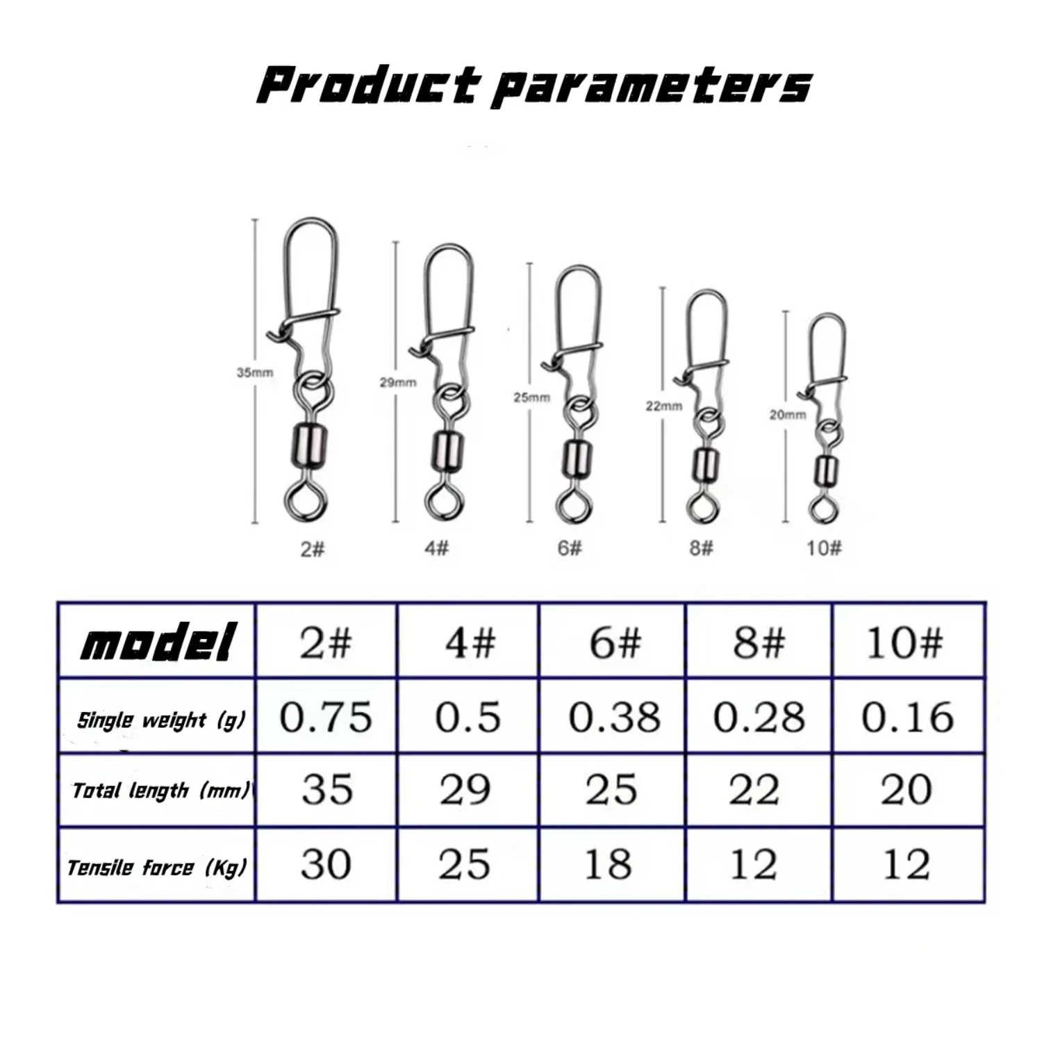 - Bearing rolling swivels with snaps: Securely connect hooks and lures to lines with smooth rotation and minimal resistance.