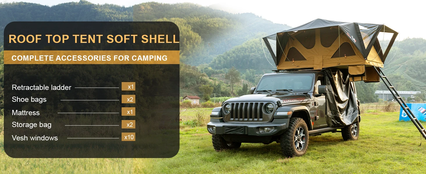 Elevate your camping experience with the Car Roof Top Tent Soft Cover Tent for Camping with Telescopic Ladder. This rugged rooftop shelter lets you sleep above your vehicle, delivering comfort, convenience, and a touch of adventure to every road trip.