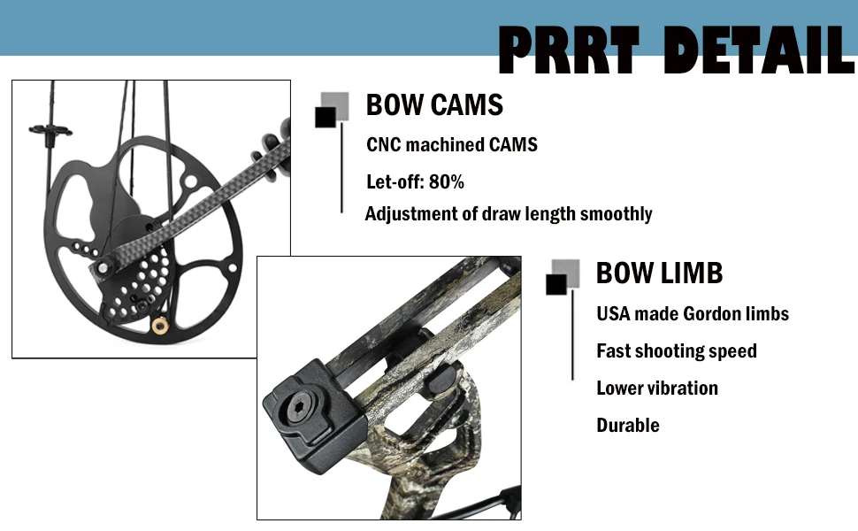 1. 【Bow Parameter】IBO 325 fps ; Axle to Axle: 31.5"; Draw Weight: 0-70lbs Adjustable, Draw Length: 9" -31" Adjustable, Brace Height: 7.2", Let-off: 80%! All adjustments are made using an Allen wrench with no need for a bow press. (If you are a beginner, recommend you use a bow press, it would be easier.)