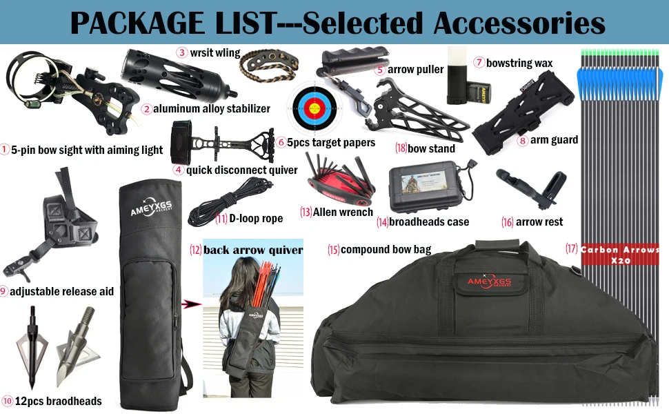 3. 【Bow Accessories】Ready to Shoot/Hunt Compound Bow Set; Package includes: 1xCompound- Bow, 1xFive Pin Optical Bow Sight, 1xArrow Rest, 1x Stabilizer, 1x Arrow Puller, 1xArm Guard, 1xBow Release(Adjustable), 1x Allen Keys , 1xBowstring Wax , 1xPeep Sight, 1xArrow Quiver, 20xCarbon Arrow (full length of 32inch), 12 x hunting broadheads, 5xTarget Paper, 1xBow Wrist Sling, 1xBow Stand, 1xQuick Disconnect Quiver, 1 x compound bow bag, 1 x Broadheads Storage Case.