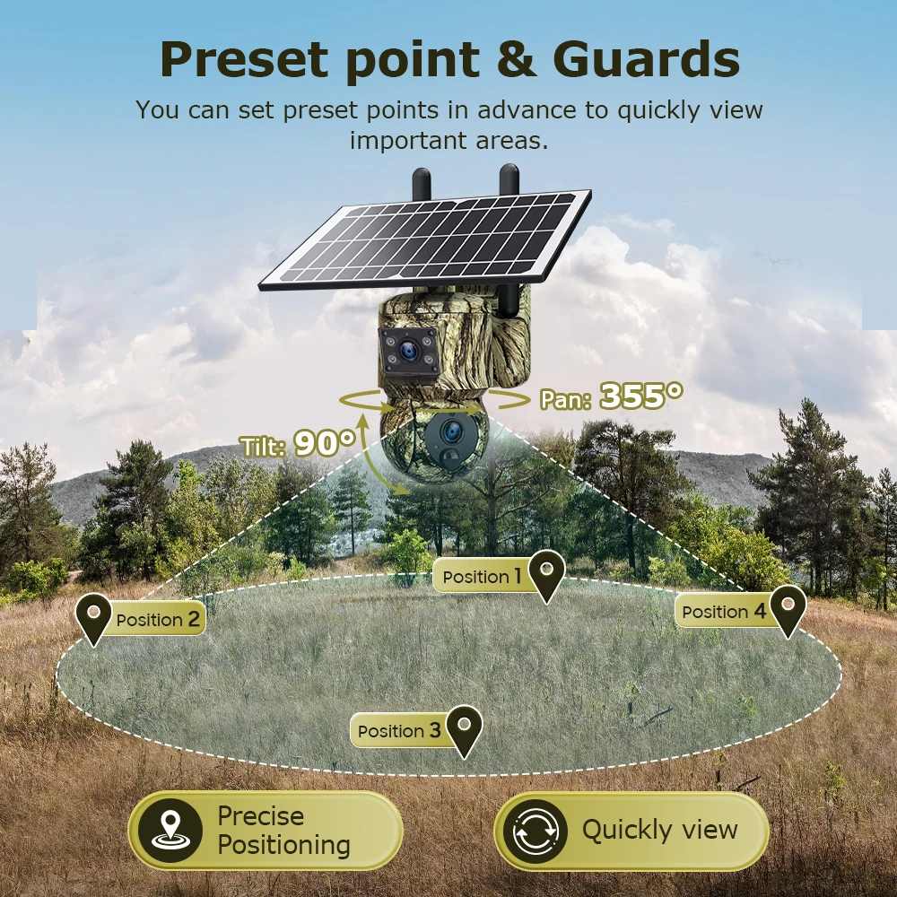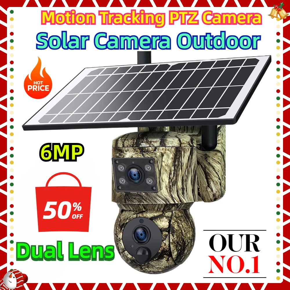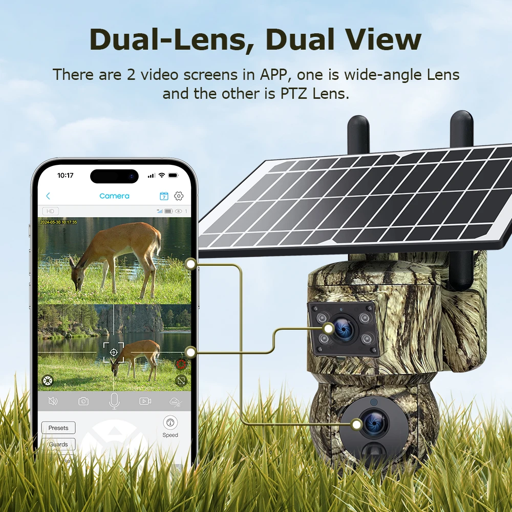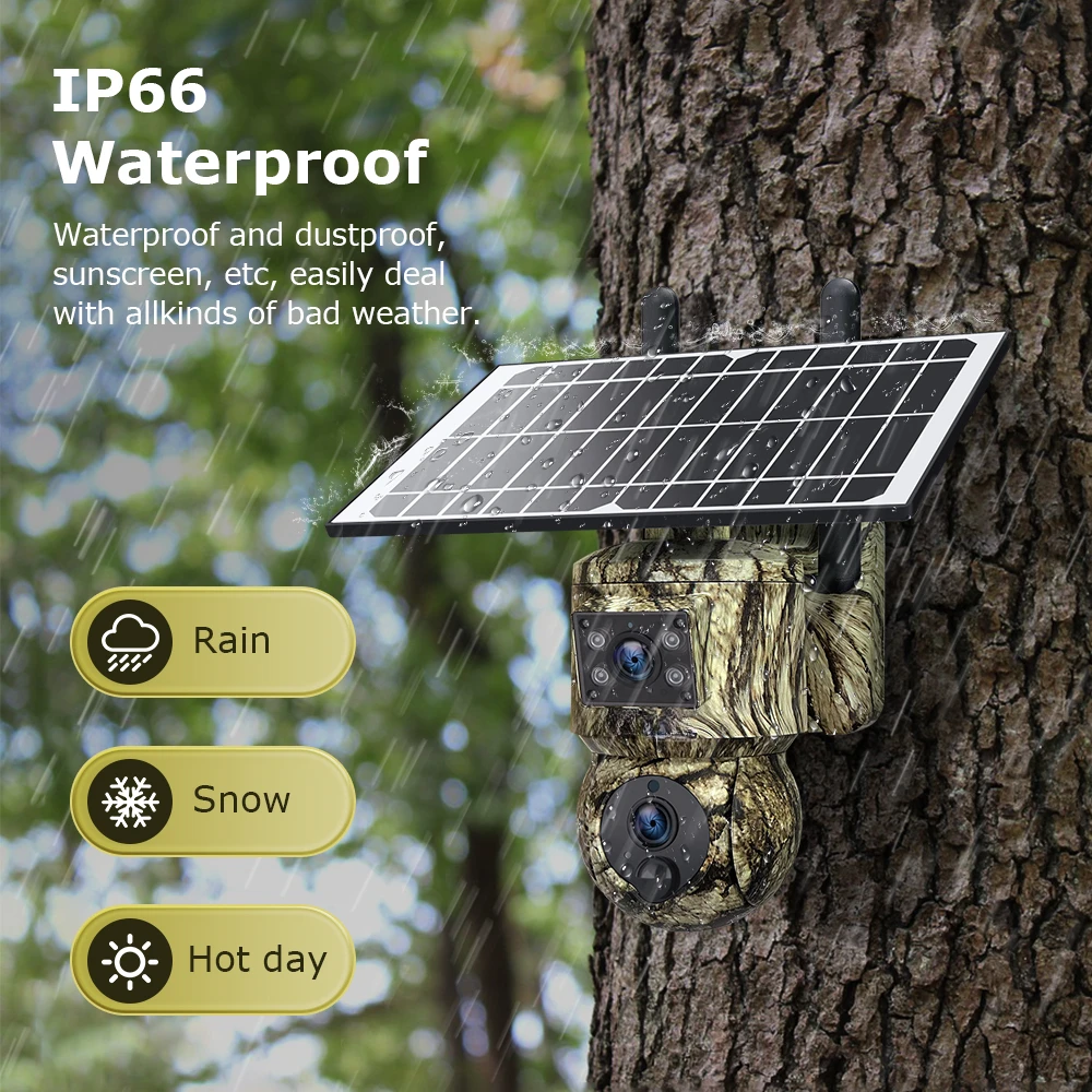 6MP Dual Lens Solar Camera Outdoor WiFi Security Hunting Animal Camouflage Cameras Motion Tracking PTZ Camera