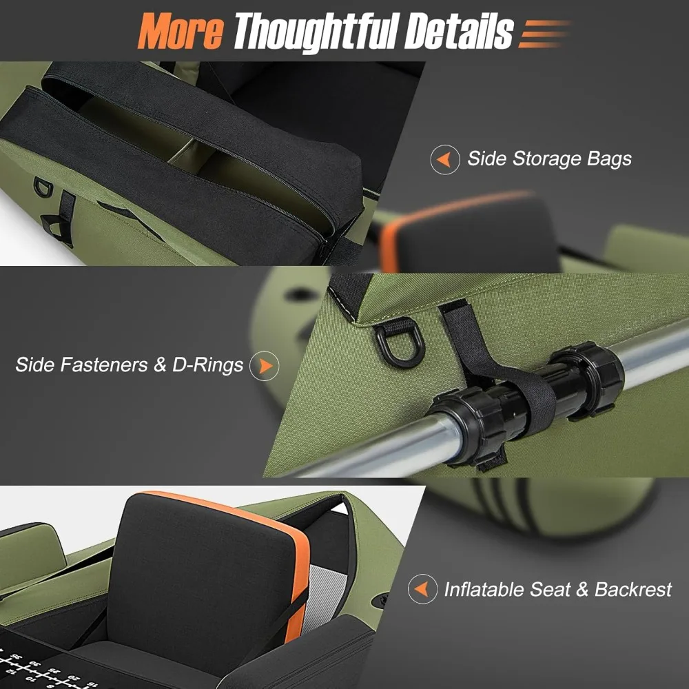 - 350lbs & Safety Floating: Inflatable fish boat is consist of 600D polyester exterior and thick PVC interior, which are both wee stitched and ensure perfect sealing for safety. Strong material would hold sufficient air and hold up to 350lbs, making you and your trophies floating on water stably.