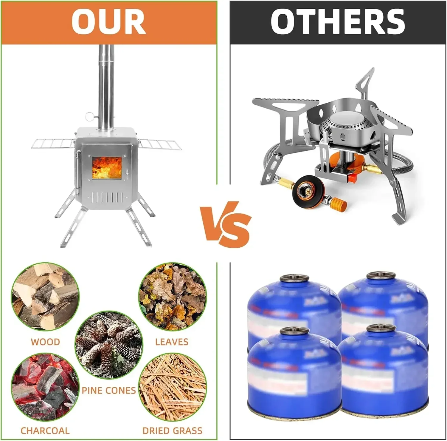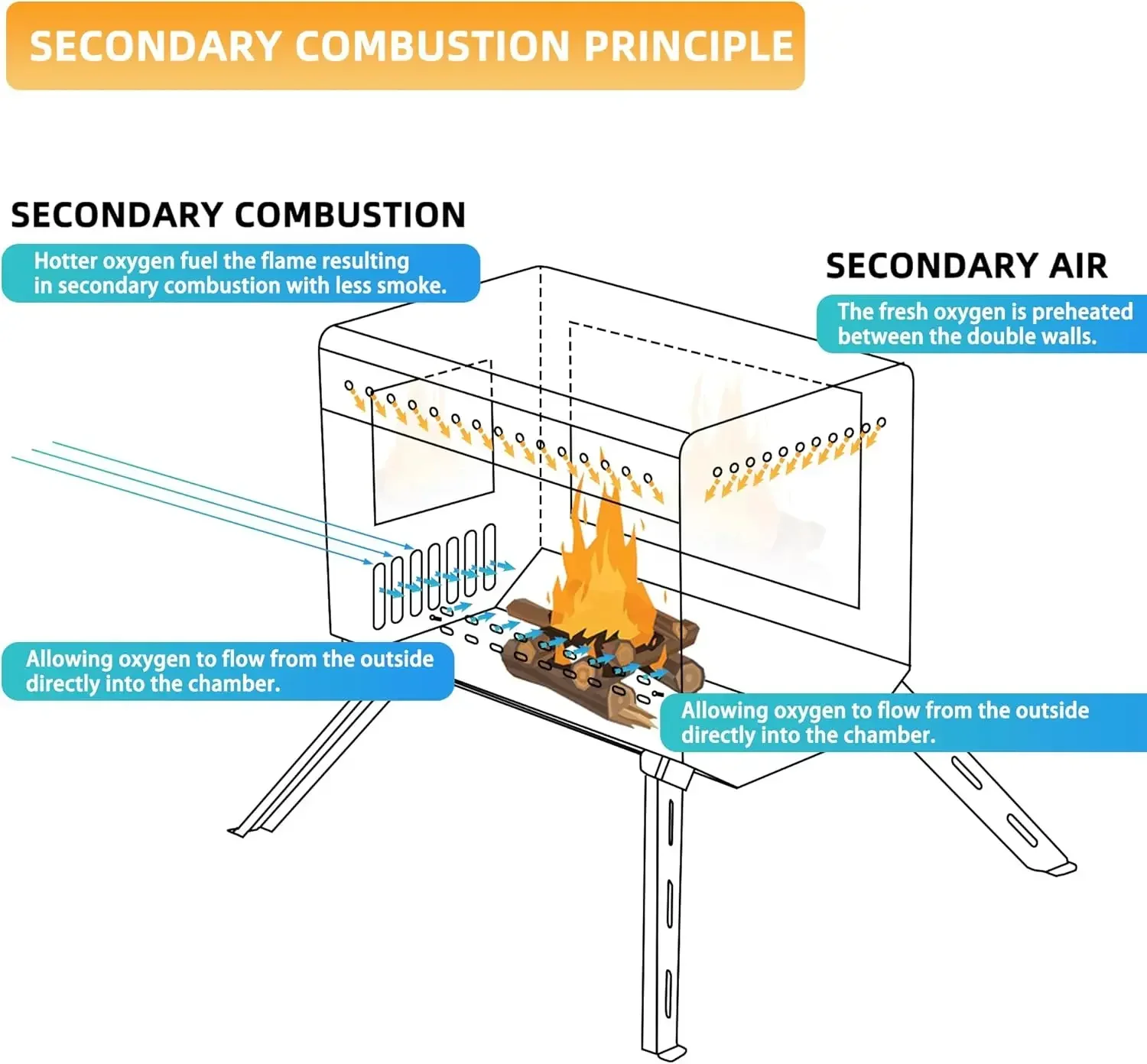 - 【SECONDARY BURN FUNCTION】>> SECONDARY BURN AND MAXIMUM HEAT OUTPUT: In order to light the fire faster and maximize the burn time, we added air intakes on three sides of the portable wood stove. It increases air intake by 25% for secondary combustion, effectively reducing wood consumption and maximizing heat output. Heats the tent in less time and reduces cooking time by 20%.