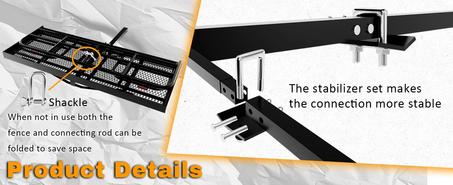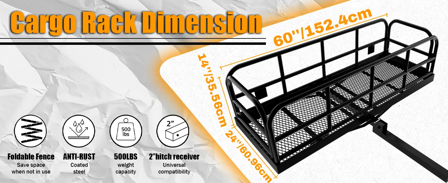 【Larger Capacity】-The tow hitch storage rack adds about 10 ft²of storage space to your vehicle,which could fit all the essentials you need for a road trip or camping.Cargo hitch carrier’s size is available in 6"or 14.4" heights.The hitch rack's guardrail also makes sure the safety of luggage